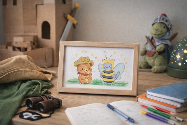 Ourson et chaton déguisés en cow-boy et abeille - Aquarelle originale 10x15 cm