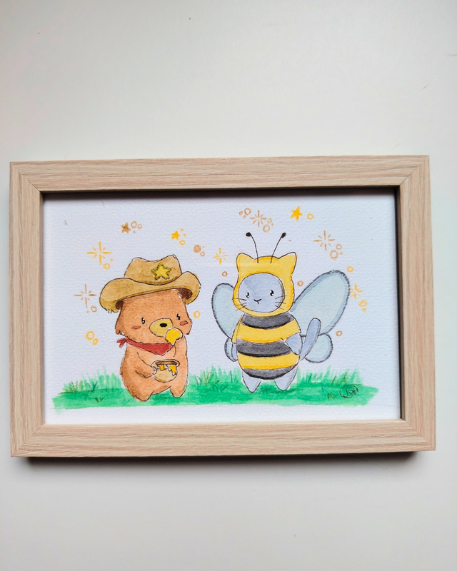 Aquarelle originale d'un ourson et d'un chaton déguisés en cow-boy et abeille. Papier de qualité, 10x15cm. Pièce unique.