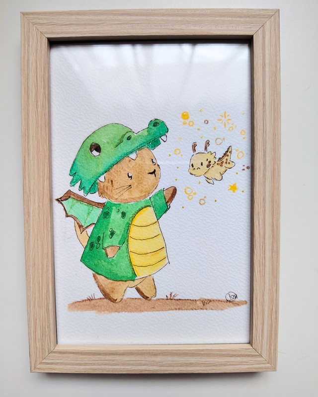 Aquarelle originale représentant un chat déguisé en dragon. Papier de qualité, 10x15cm. Pièce unique.